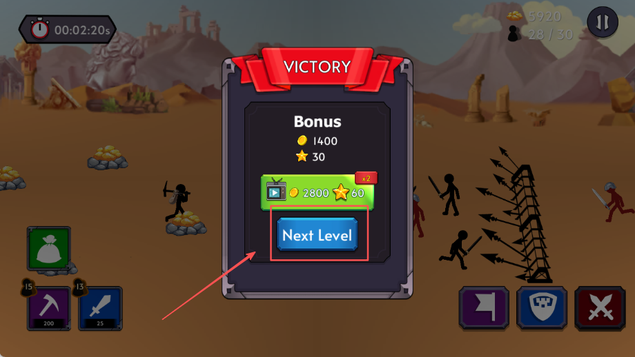 3、成功击败雕像通关后,点击继续按钮进入下一关,新的关卡会有更强的敌人和更复杂的挑战,需要不断提升军队实力和战术策略。