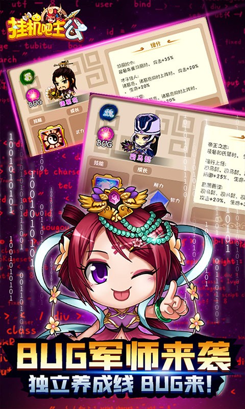 《挂机吧主公(千万亿漏洞充)》是一款集聚休闲、策略、养成与一身的三国卡牌游戏;特殊福利版本 【BUG漏洞版】登场,玩家可以通过特权,直接获得逆天级福利,比如直接提升等级至70级,直接高端开局;也可直接获得充值折扣券,价格直接减半,爽!;还能双倍奖励,激活后,任意充值都能获得双倍奖励,太残暴了!!天天送千万、亿元宝,点一下直接货币爆炸;上线邮件,20亿银币、5亿元宝,挂机刷BUG,直接开元宝、开充值、开GM,燃起来了!!